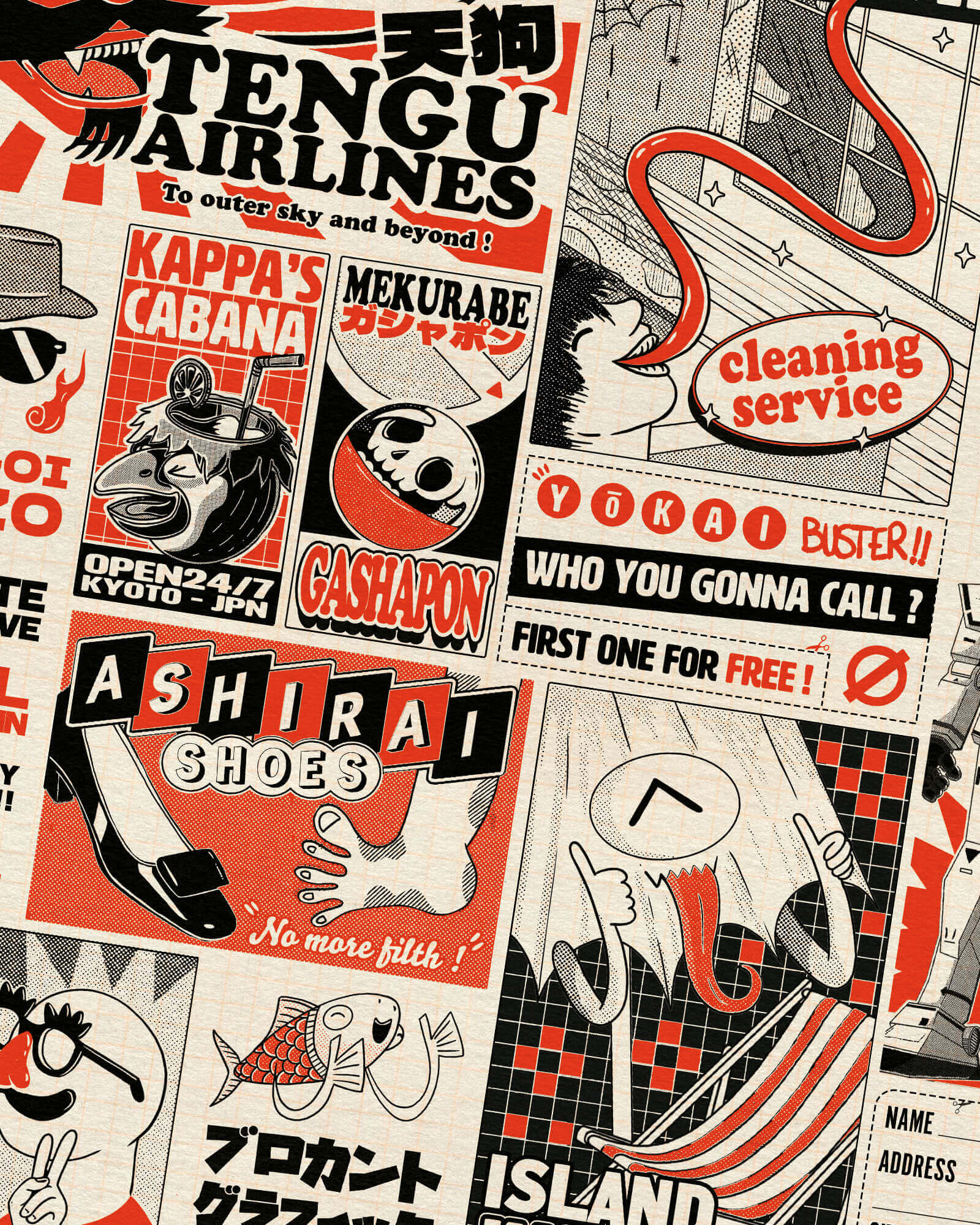 Les yōkai sont un type de créatures surnaturelles dans le folklore japonais. Ils sont souvent représentés comme des esprits malfaisants ou simplement malicieux démontrant les tracas quotidiens ou inhabituels. Ici représentés sous la forme de publicités vintages !