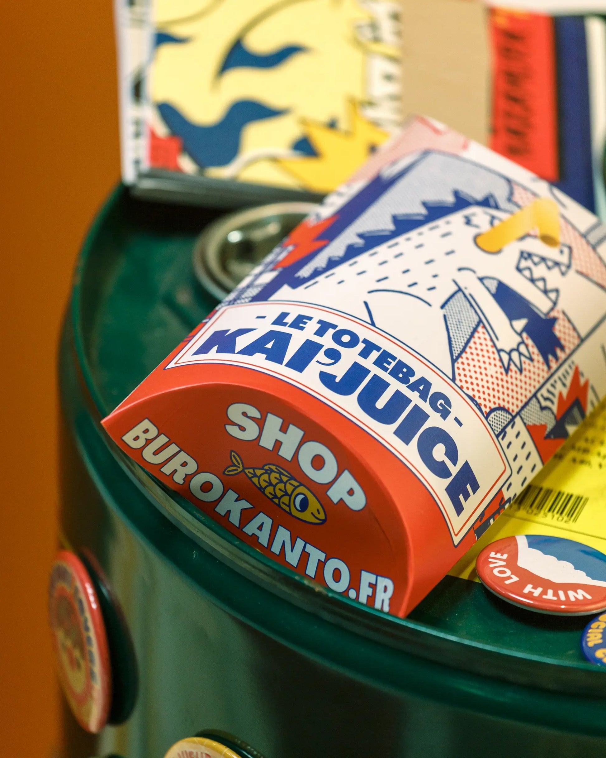 Une publicité comme tu n’en verras jamais dans le métro : Kai’Juice, la boisson énergisante préférée des monstres géants. Sur ce totebag, un Godzilla survolté brandit fièrement sa brique de jus — un design exclusif signé Burokanto.