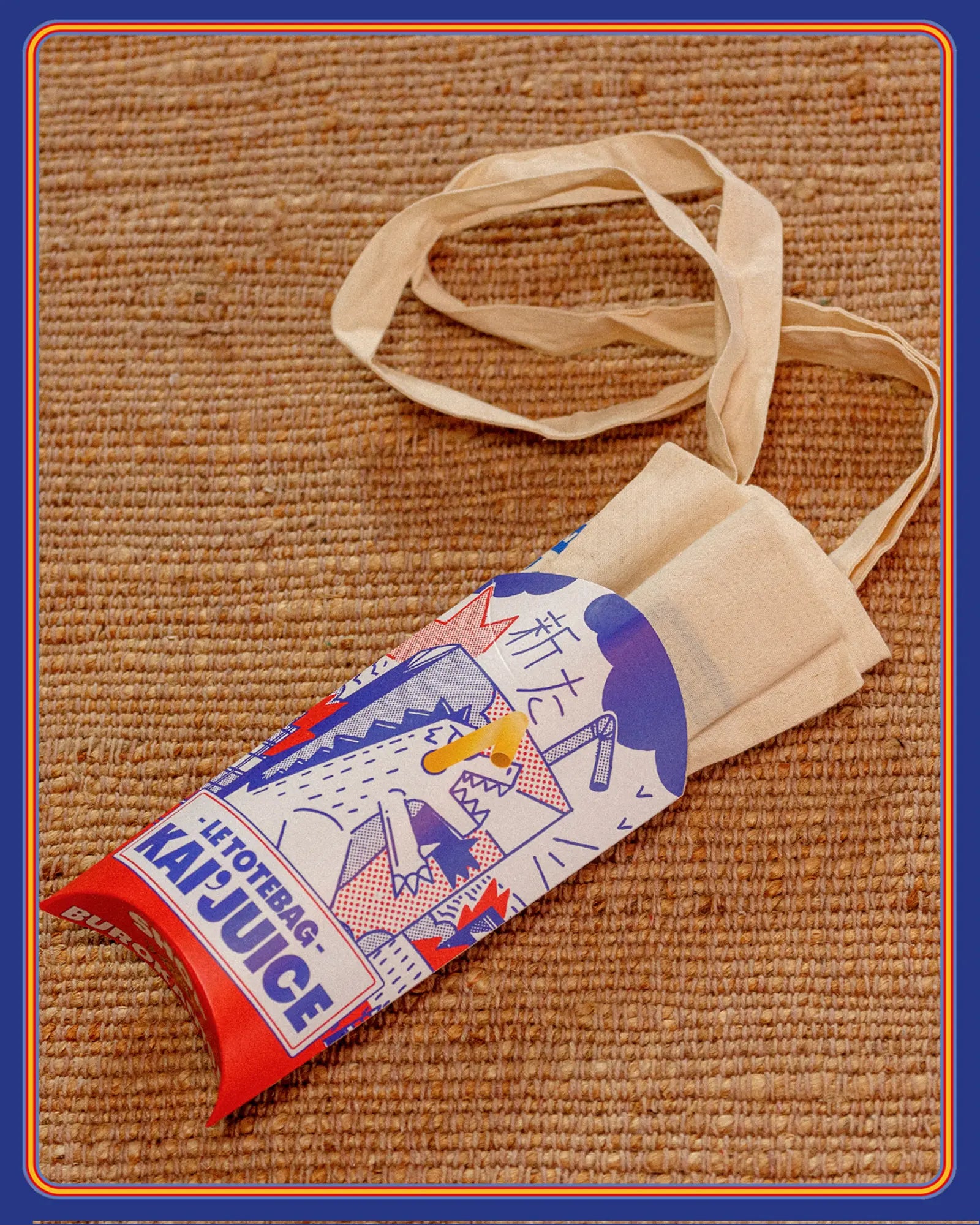 Notre totebag arrive dans son packaging exclusif, une brique de Kai'Juice rien que pour vous !